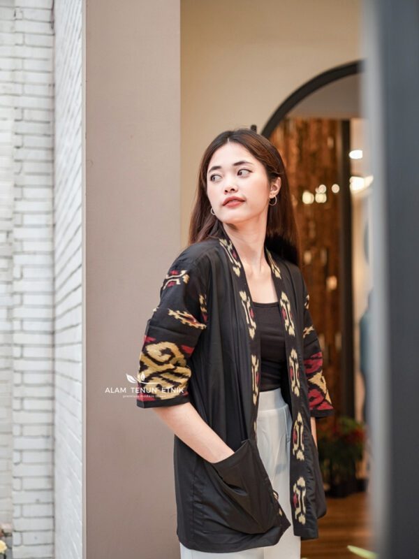 Motif tenun berwarna emas dan merah tua memberi sentuhan etnik yang modern, seolah kilau hangat di tengah kedalaman hitam malam. Desainnya unisex, ringan, dan mudah dipadukan untuk berbagai suasana — dari acara santai, pekerjaan kreatif, hingga momen makan malam yang lebih formal.